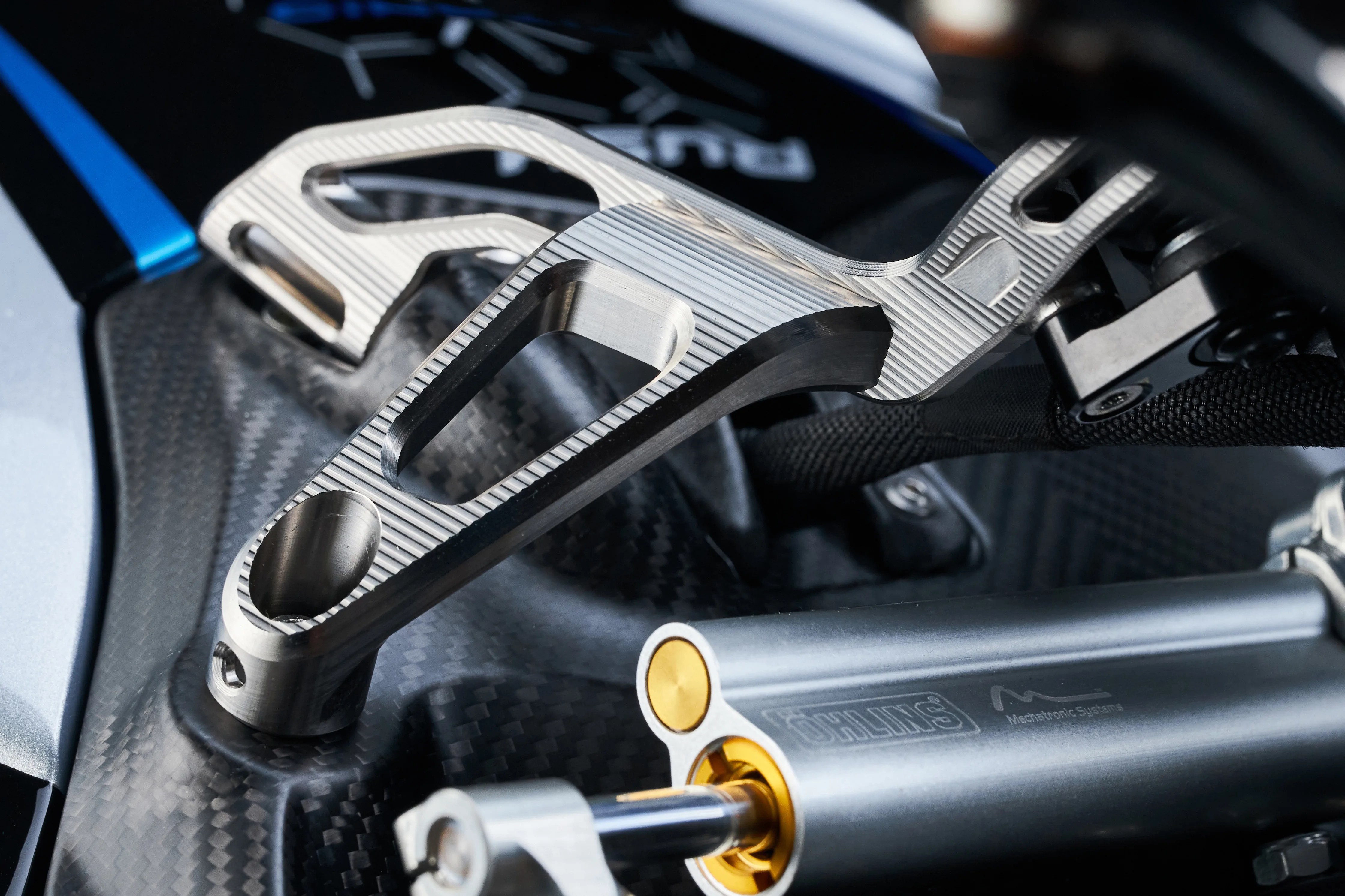 La Rush Titanio est typiquement le genre de machine qui se comprend en s’approchant. De loin, on voit une hypernaked italienne agressive. De près, on découvre un empilement de textures, d’usinages et de pièces raffinées qui racontent une autre histoire. L’aluminium anodisé teinté en bleu Titanio, très éloigné des habituelles couleurs tricolores italiennes, apporte une vraie personnalité à l’ensemble. Bouchon de réservoir, écrou de roue arrière, pivot de bras oscillant ou habillage de phare : tout semble pensé pour faire sentir au propriétaire qu’il n’achète pas seulement une moto, mais une pièce exclusive.