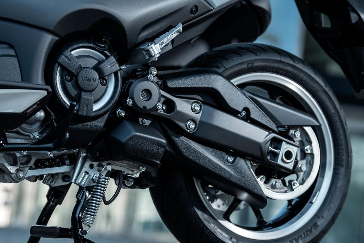 Sous le carénage, le TMAX 2025 conserve son bicylindre en ligne de 560 cm³, désormais conforme à la norme Euro 5+. Avec une puissance de 47,6 chevaux et un couple maximal de 55 Nm à 5 250 tr/min, il offre des performances suffisantes pour les trajets urbains et périurbains, tout en restant accessible aux titulaires du permis A2.